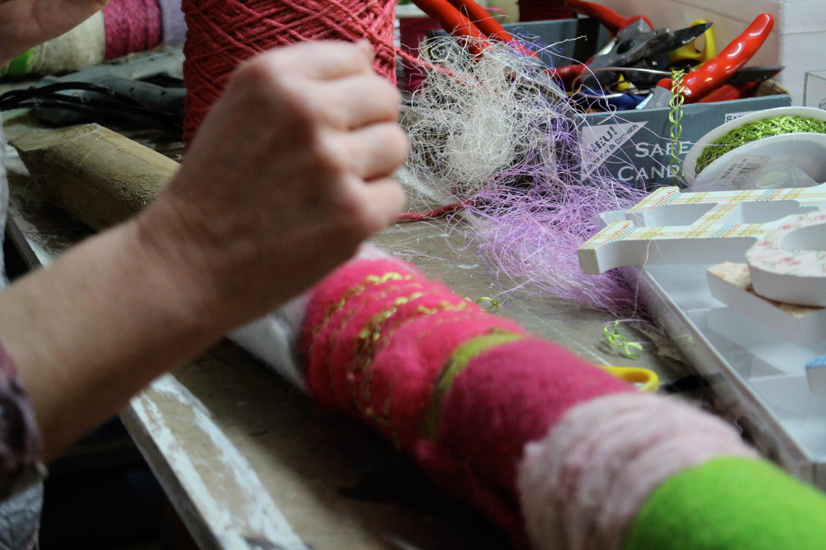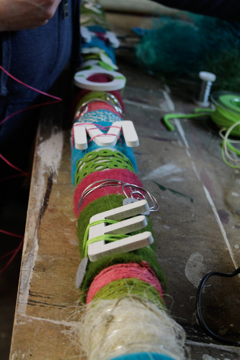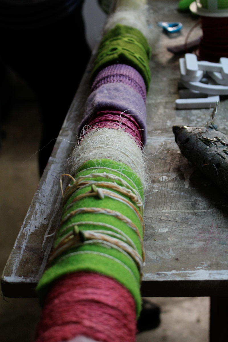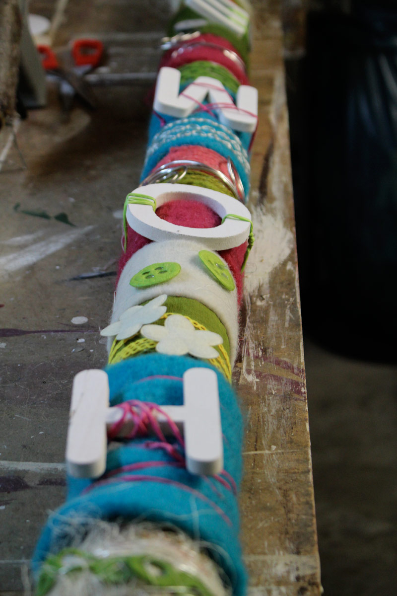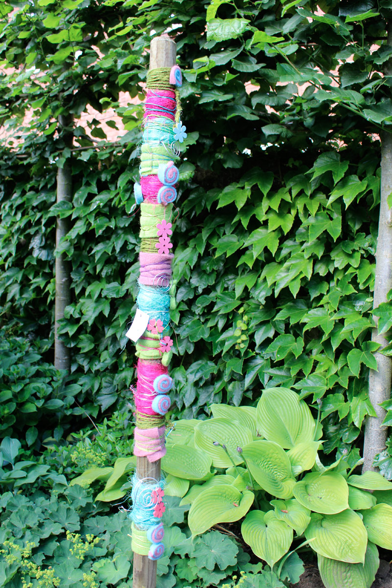 Die Materialien für die Holzstange (ca. 2 m Länge, Durchmesser 6 cm) waren Gimpe, Filz, Bänder, Holz-Blüten, Sisal, Perlen.