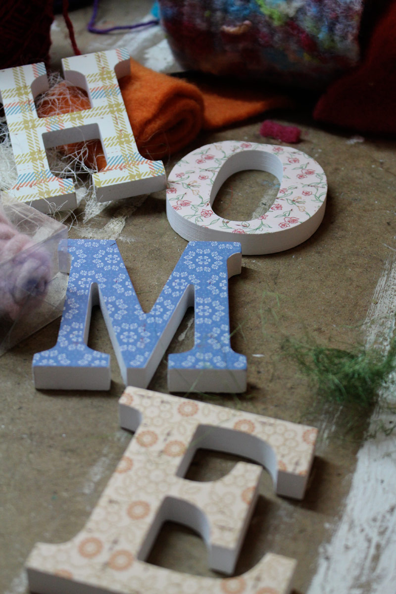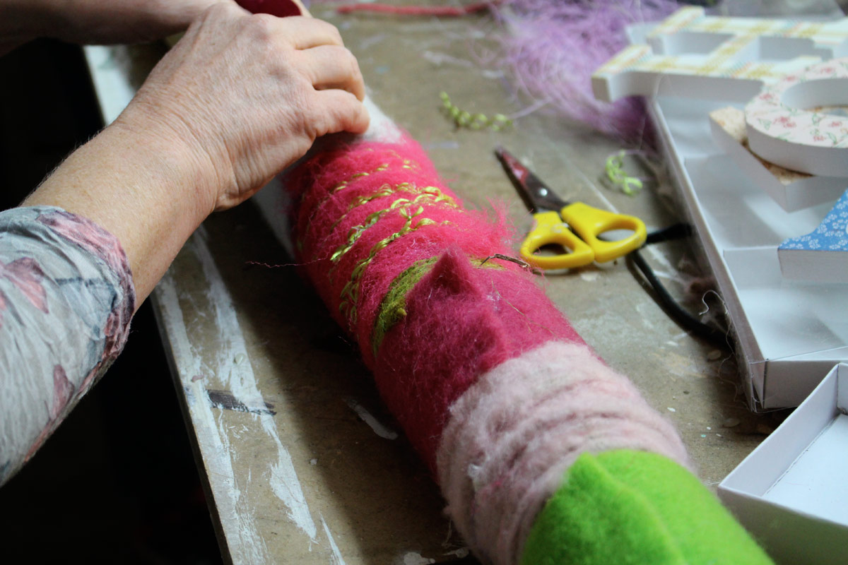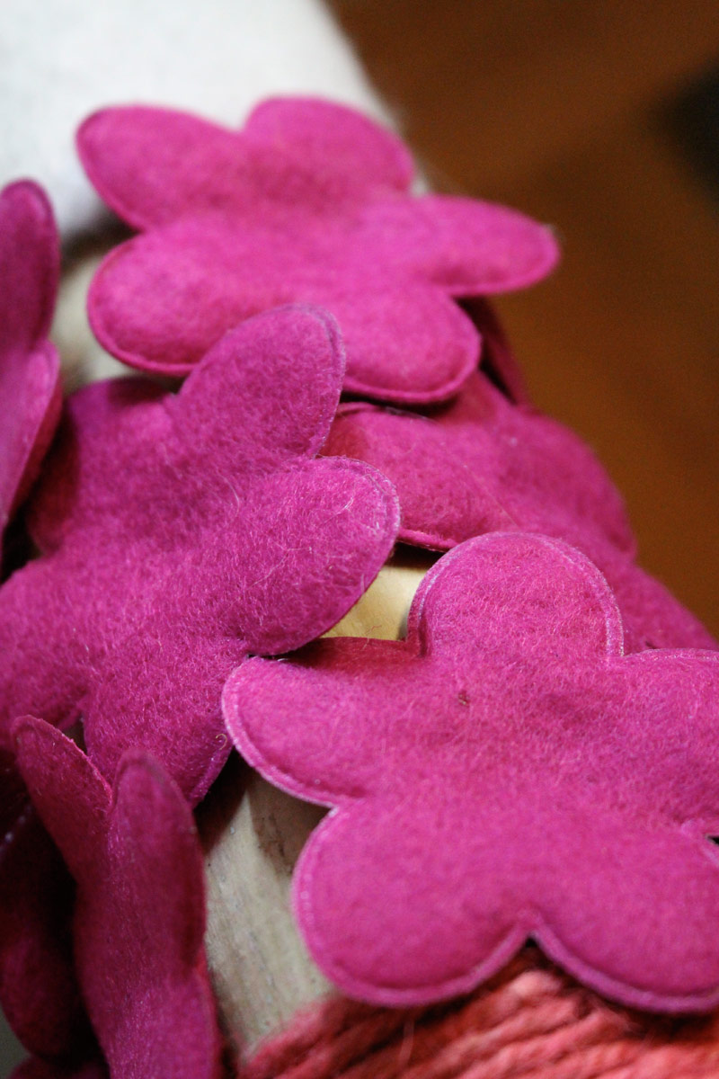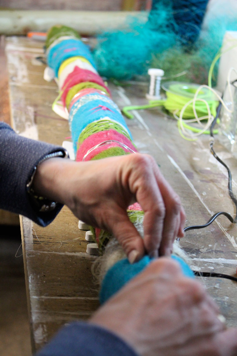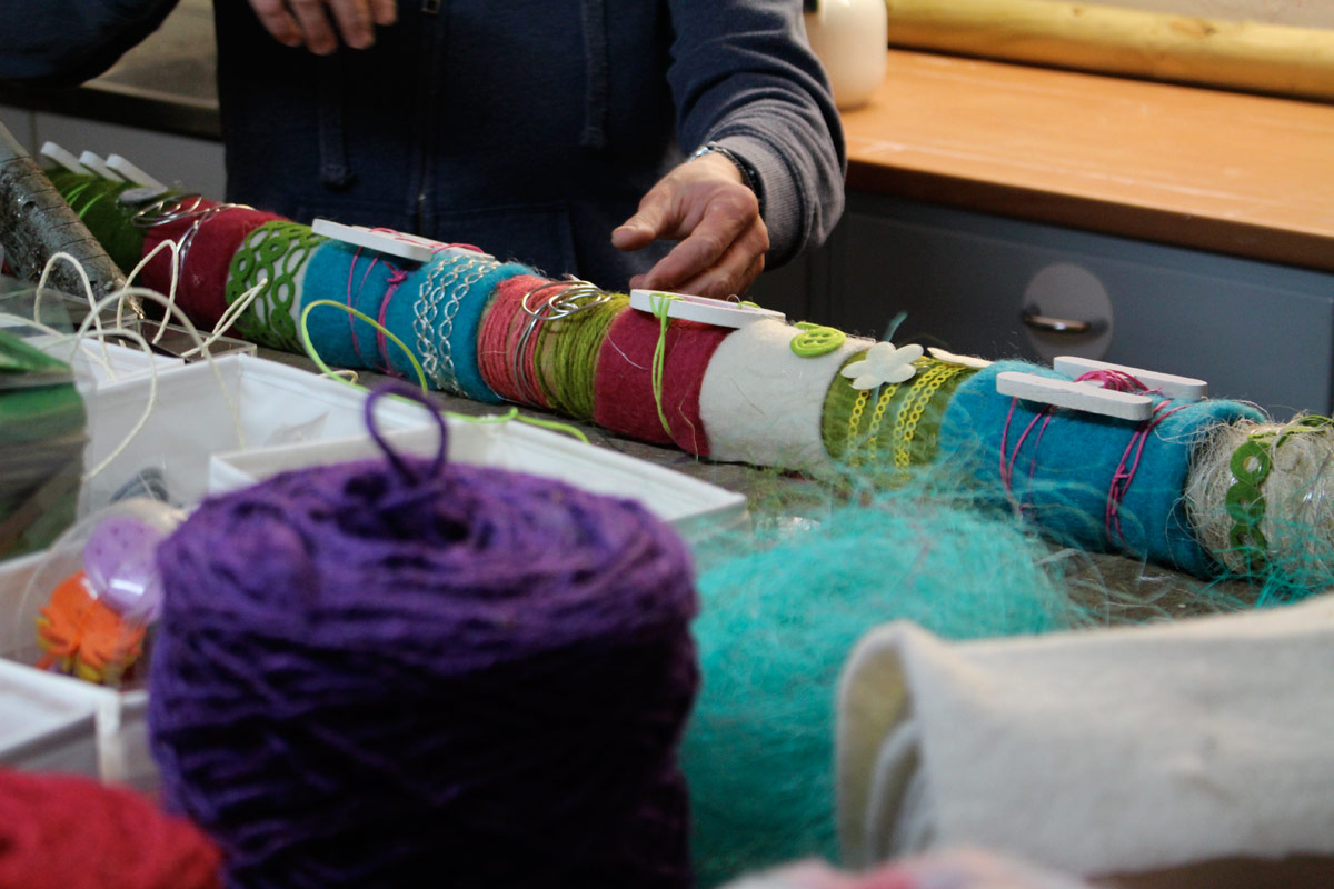 Die Materialien für die Holzstange (ca. 2 m Länge, Durchmesser 6 cm) waren Gimpe, Filz, Bänder, Holz-Blüten, Sisal, Perlen.