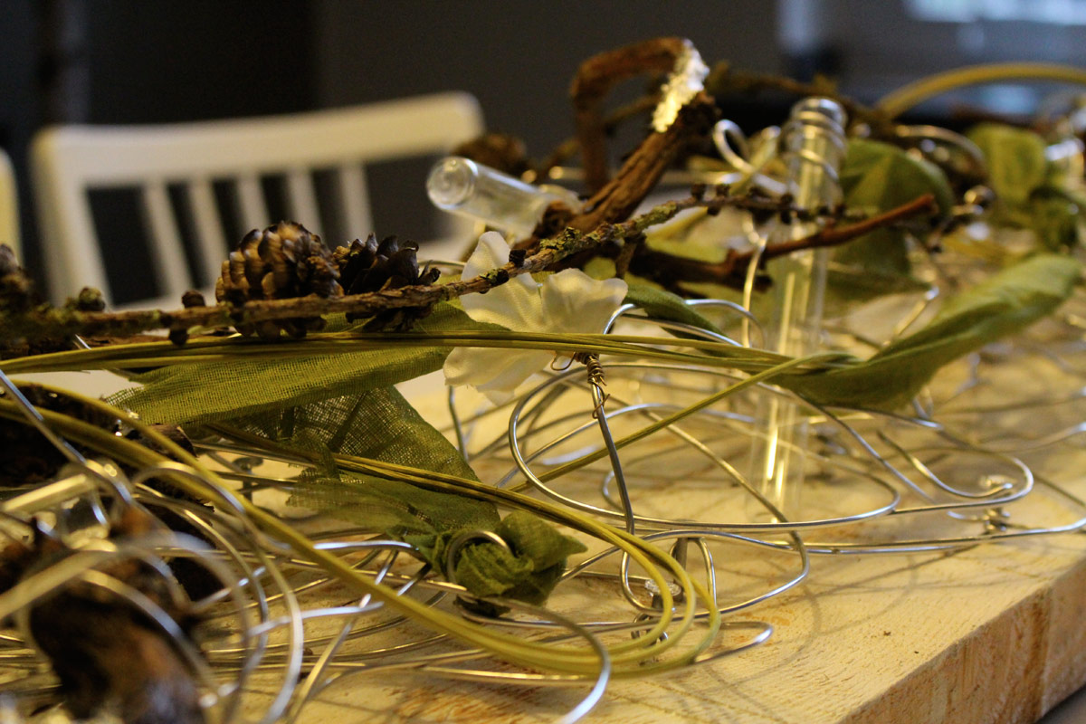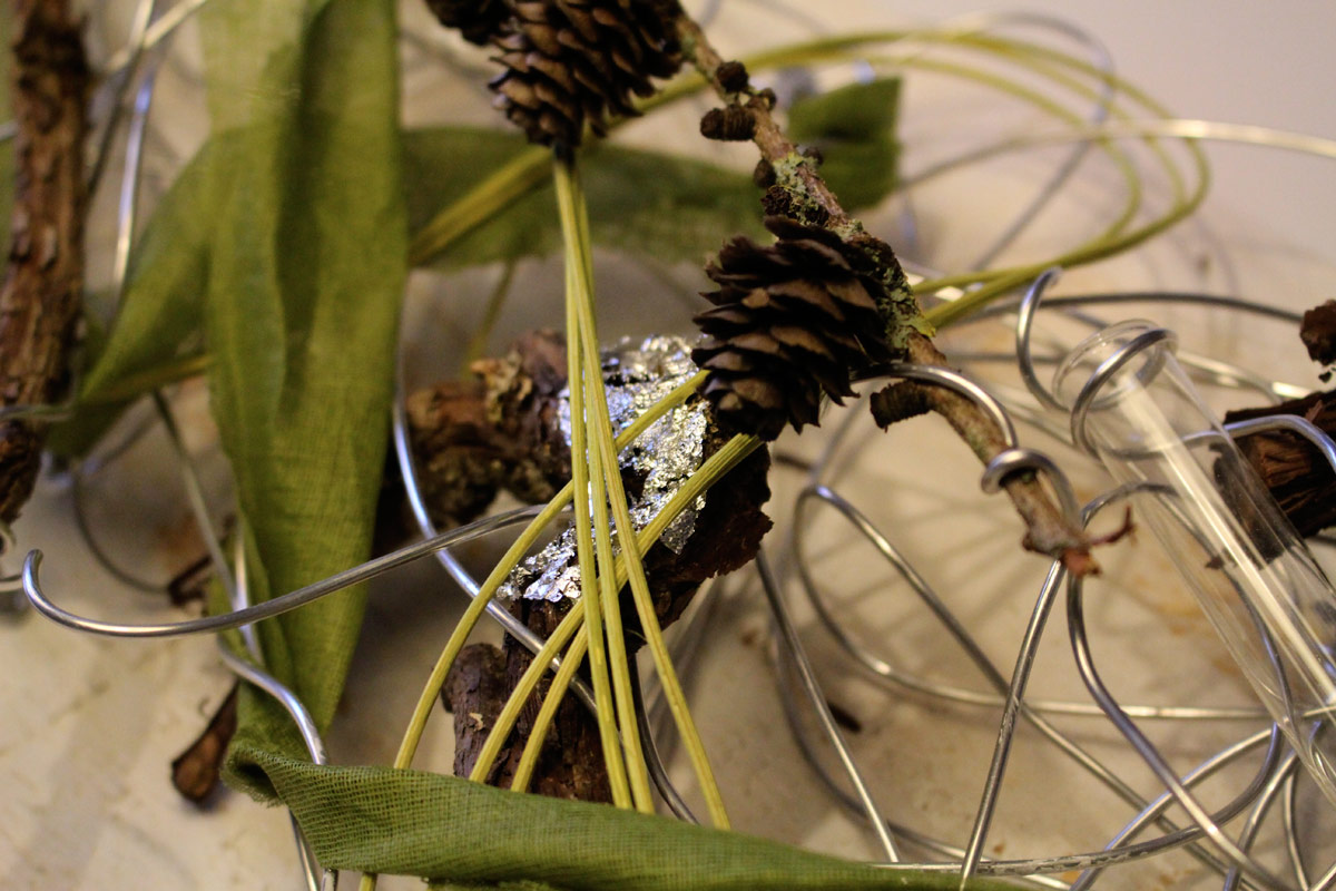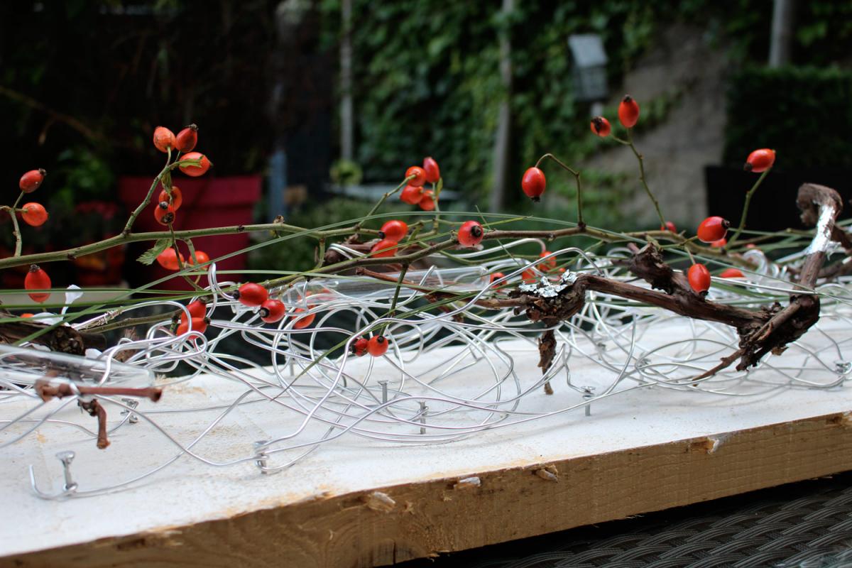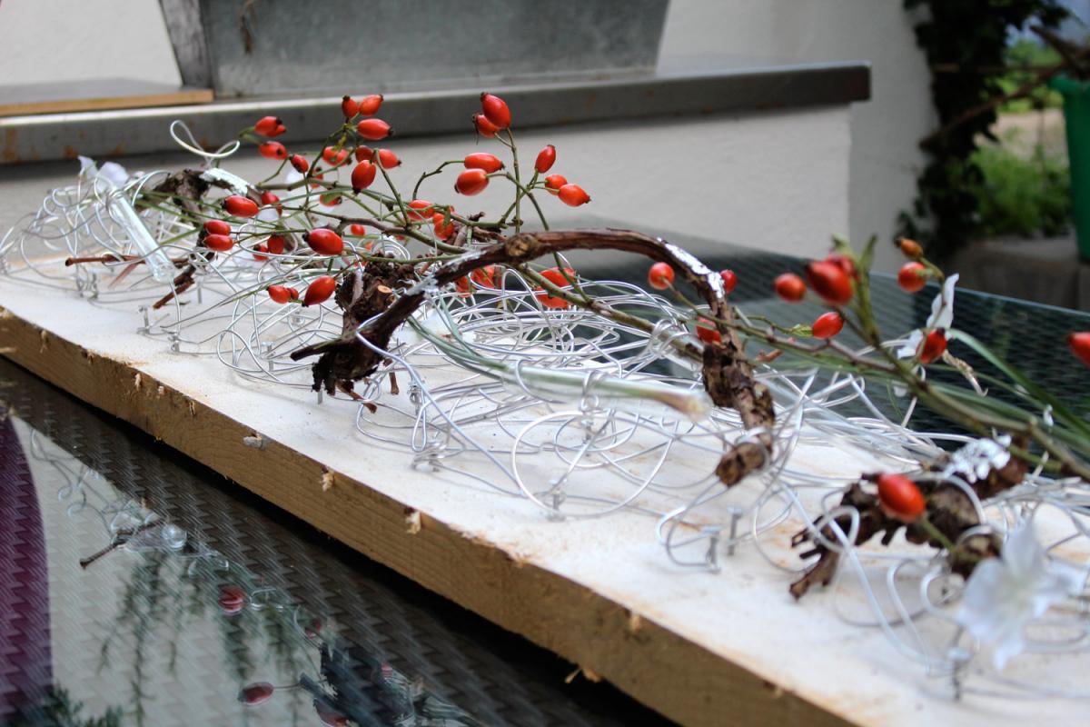 Mit Alu-Draht, Zweigen, Stoffen, Schlagmetall, Seidenblüten usw. wurde ein Bild gestaltet. Die Farben konnten selbstverständlich selbst gewählt werden. Größe 140×45 cm. Ein ungewöhnliches Werkstück für das Zuhause.