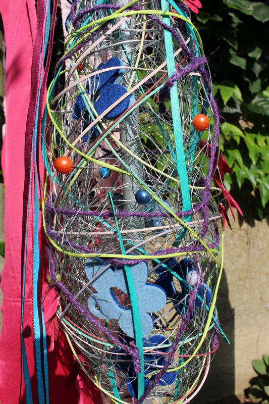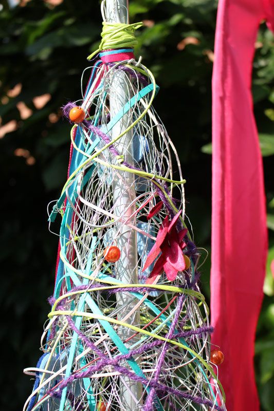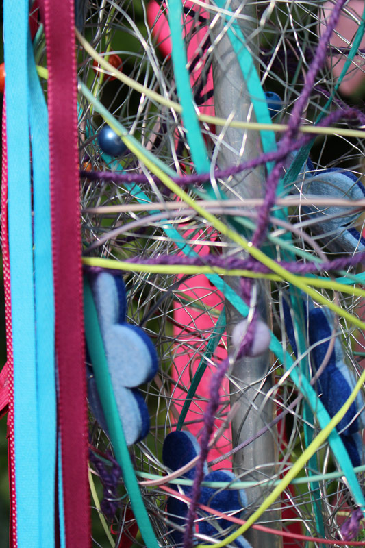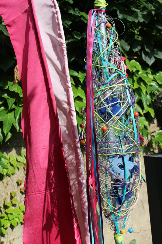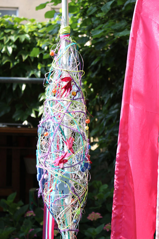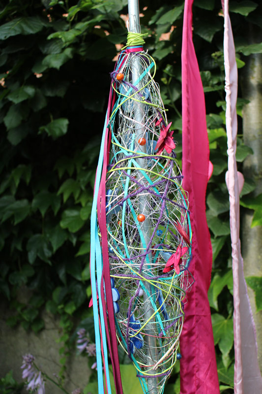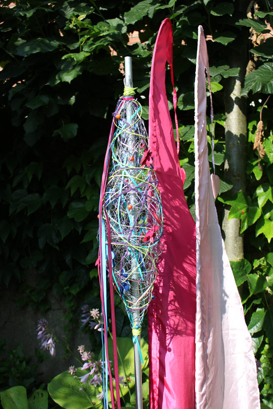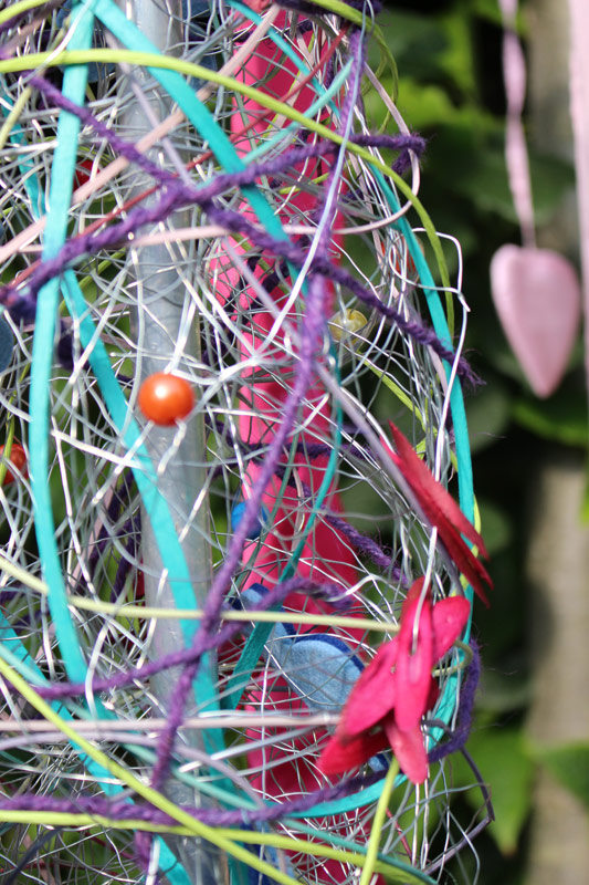 Der Garten bekommt für den Sommer bei diesem Workshop einen bunten Farbkleks. Wir gestalten eine Spindel aus Draht, die auf ein Alu-Rohr gefädelt wird.